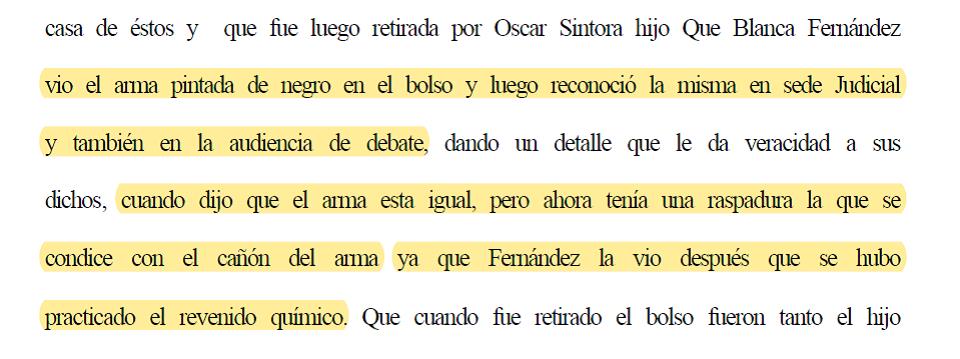 “No cree que sea posible reconocerla entre 20 armas iguales, según su experiencia como empleada policial, excepto que entre todas las armas a una le falta la base del cargador. Esto es una deducción, en realidad no le ha pasado que vayan a hacer un reconocimiento de objetos, once años después. Cuatro años estuvo trabajando en la calle y llevó a cabo muchos secuestros de armas, pero este fue el primero” (p. 97 sentencia).
