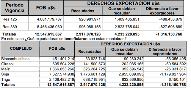 En el informe elaborado por Cafiero y Javier Llorens, integrante de Stripteasedelpoder.com , habían relevado que el total exportado desde noviembre del 2007, cuando estaba en vigencia la resolución 389 -previa a la 125- ascendía a U$S 12,5 mil millones de ese entonces, con un total recaudado en retenciones por U$S 2,9 mil millones.