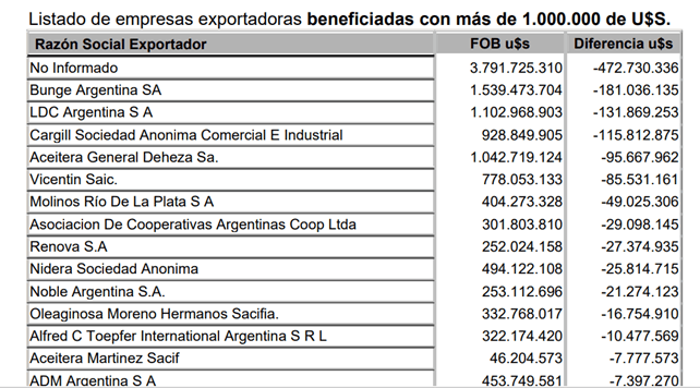A la vez, el nombre de las empresas que se birlaron esos U$S 1,3 mil millones, aparecen en la siguiente tabla extraída de ese informe. Allí vemos que quien encabeza la principal diferencia están bajo la denominación de exportador “No informado”, que se alzaron con más de U$S 472 millones.