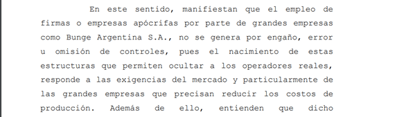 En palabra de los fiscales María Marta Schianni y Carlos Gonella, “el empleo de firmas o empresas apócrifas por parte de grandes empresas como Bunge Argentina S.A., no se genera por engaño, error u omisión de controles, pues el nacimiento de estas estructuras que permiten ocultar a los operadores reales, responde a las exigencias del mercado y particularmente de las grandes empresas que precisan reducir los costos de producción”.