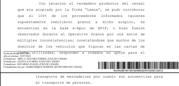 Por ejemplo, Lemos trabajaba como una acopiadora e intermediaria de productores para preservar y vender lo cosechado a Bunge. En base a los cómputos de la AFIP, muchos de los dominios de los vehículos utilizados para traslado de esos granos “responden a rodados no aptos para el transporte de mercaderías por cuanto son automóviles para el transporte de personas”.