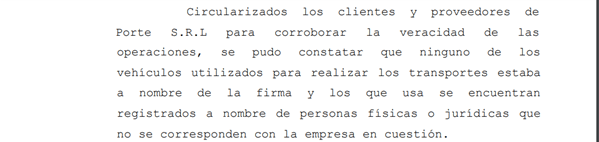Lo mismo pasaba con Porte SRL, que según la AFIP, en el análisis de las cartas de porte automotor, “un 34% de ellos eran vehículos utilitarios o sin capacidad para el transporte de granos”. De hecho, “ninguno de los vehículos utilizados para realizar los transportes estaba a nombre de la firma y los que usa se encuentran registrados a nombre de personas físicas o jurídicas que no se corresponden con la empresa en cuestión”.