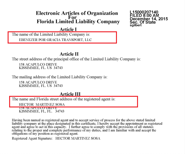 Héctor Horacio Martínez Sosa tiene, hasta donde se sabe, dos offshores creadas en Florida, Estados Unidos, considerado un distrito como guarida fiscal. La primera se llama EBENEZER POR GRACIA LLC. Fue registrada en diciembre de 2015. En todos los reportes anuales, incluyendo el de febrero de este año, un mes antes de que se destapara el escándalo de los seguros, siempre figuró como el único gerente de ella, en ausencia de otros miembros. Esto es porque las LLC, el equivalente a las SRL en nuestro país, cuando se tipifica el título de MGRM, quiere decir que el administrador trabaja en la firma tanto como manager como miembro único, como ocurre en este caso.