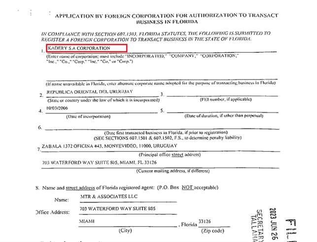 La segunda empresa offshore se llama KADERY S.A. CORPORATION. Se creó el 26 de junio de 2023. Casualidad o no, ella la parió tan solo un par de días después de que se anunciara que la fórmula Sergio Massa – Agustín Rossi, sería la fórmula del oficialismo nacional de ese entonces, para competir en las elecciones presidenciales, como así también el cierre total a toda posibilidad de que Fernández pueda ir por su reelección. Como si esto pudiera marcar el fin de las jugosas comisiones con la Nación Seguros.