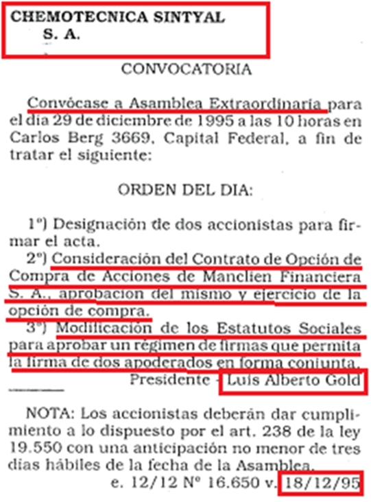 Dos días después, el 18 de diciembre, con el cuerpo de Roberto aún caliente, mediante una “Asamblea Extraordinaria” de accionistas, sus hijos Silvia, Luis Alberto y Eleonor, tomaron el control total de Chemotecnica Sintyal SA. Y sin esperar la declaración de herederos, simularon una venta total de las acciones a una compañía offshore constituida en Panamá, llamada Manclien Financiera SA. Firma de abogados con nombres de paja luego involucrados en los Panamá Papers.
