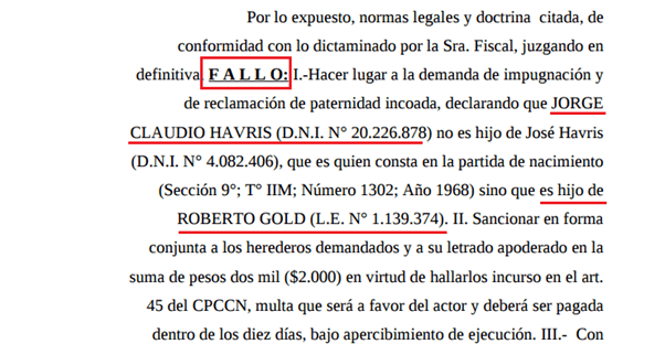 El fallo textualmente dice: “Hacer lugar a la demanda de impugnación y de reclamación de paternidad incoada, declarando que JORGE CLAUDIO HAVRIS (D.N.I. N° 20.226.878) no es hijo de José Havris (D.N.I. N° 4.082.406), que es quien consta en la partida de nacimiento, sino que es hijo de ROBERTO GOLD (L.E. N° 1.139.374). II. Sancionar en forma conjunta a los herederos demandados y a su letrado apoderado en la suma de pesos dos mil ($2.000) en virtud de hallarlos incurso en el art. 45 del CPCCN (obstrucción de la justicia)”