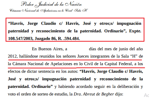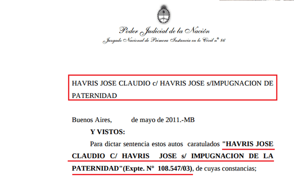 Todo está en el expediente 108.547/2003 titulado “Havris Jorge Claudio c/ Havris y otros / impugnación paternidad y reconocimiento de la paternidad”. Este fue favorable a Jorge, físicamente muy parecido a Roberto, en ambas instancias, y aceptada sin remedios, por la familia Gold. Y es la primera parte de la serie de Netflix, dado que en ella, Leonor, Silvia y Luis, primero hicieron todo lo posible para que esta filiación de paternidad nunca se concretara. Luego, que gran parte de la millonaria herencia que le correspondía jamás la cobrara.