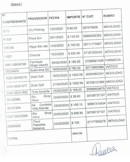 Algunos de estos y otros anteriormente mencionados, se pueden ver en el anexo de la resolución 114/20 reproducida seguidamente, donde se le autoriza a Parisi un reintegro de $4.869 (83 dólares de entonces, 89 mil pesos actuales) en “alimentos” “productos farmacéuticos” y “estacionamiento”. Pero en los detalles de la factura del anexo salen sushi, librería, combustible, decoración, etc.