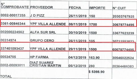 26 tickets de nafta, la mayoría en la localidad de Villa Allende donde la decana vive, algunos de ellos los días sábados o domingos en localidades turísticas de Córdoba. Entre estas facturas sobresalen las de los proveedores: YPF Villa Allende, Shell Golf (Villa Allende), De la VIlla SRL, Estación de Servicios S.A, la Oil Petro Salsipuedes SRL (Salsipuedes), La Cuarta S.A (Río Primero) Estación del Cerro SRL (Capilla del Monte).