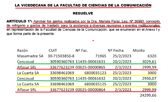 Fue tal la desprolijidad de todo esto, que el 13 de abril del 2023, la facultad debió sacar la resolución 304/23 donde en dejó “sin efecto la RD-2023-197” y a continuación incurriendo en un enorme enredo aprobó “los gastos realizados por la Dra. Mariela Parisi…. en concepto de refrigerio y combustible para la asistencia a diversas reuniones y eventos institucionales en representación de la Facultad de Ciencias de la Comunicación de hasta pesos tres mil ($3.000) que se enumeran en el Anexo I de la presente, como así también los correspondientes a Masamadre S.A y Cencosud S.A (reiteramos, el primero gastado un sábado y otro un feriado) que se detallan en el Anexo I de la presente y que exceden el monto de pesos tres mil ($3.000)”.