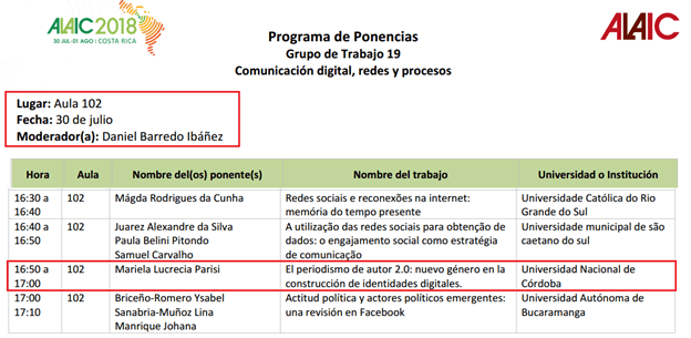 Además, asistió para exponer una “ponencia” personal de diez minutos de reloj, de 16.50 a 17 hs, no como una conferencista invitada especial, sino como una docente cualquiera de los cientos que participaron de ese congreso. De hecho el título fue “El periodismo de autor 2.0: nuevo género en la construcción de identidades digitales”, tema que sería el mismo de su tesis doctoral de 2021.