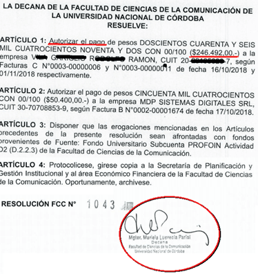 Esta compra, nuevamente se hizo mediante factura C de monotributo. Además, mientras en los considerandos de la resolución la decana dispuso un pago a su docente de 169 mil pesos, abajo en su articulado, el pago se elevó a 189.000. ¿Habrá sido un error de comunicación de la decana de comunicación?