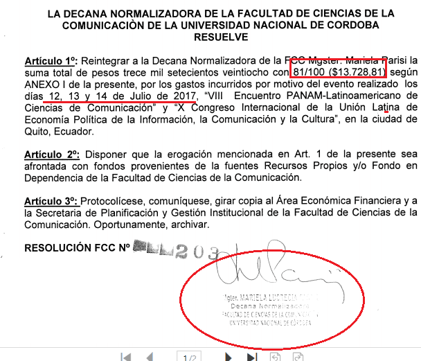 Con un costo de 915 dólares, casi un millón de pesos actuales, la compra del pasaje fue aprobada el 11 de abril del 2017, mediante la resolución 203/17 firmada por la propia Parisi, donde se especifica que la duración del congreso es de tres días, Y fue en carácter de “reintegro” dado que la decana normalizadora había comprado el pasaje a la empresa Despegar, sin tener una aprobación previa del Rector. Una primera irregularidad, observada luego por la propia área contable del rectorado.