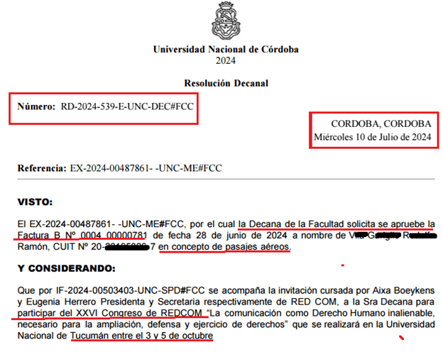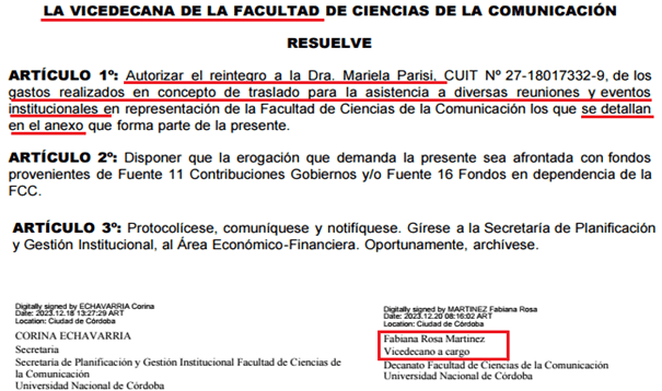 Las otras dos, (37/24 y 539/24) para que la decana Parisi asista este año a la Asamblea Anual de la Red de Carreras de Comunicación Social y Periodismo (REDCOM) en la Matanza provincia de Buenos Aires y al XXVI Congreso de REDCOM “La comunicación como Derecho Humano inalienable, necesario para la ampliación, defensa y ejercicio de derechos” en Tucumán.