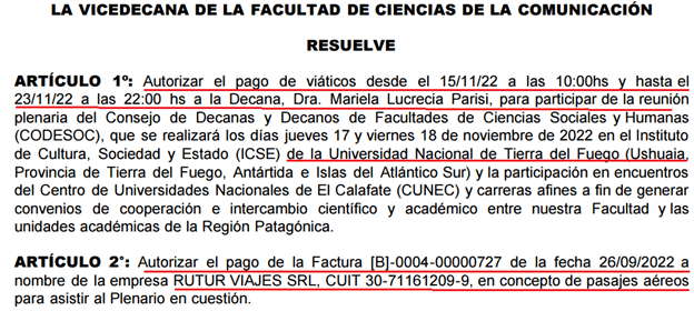 Este nuevo paseo fue aprobado mediante la resolución 892/22 firmada por la vicedecana de Comunicación, Fabiana Martínez. En ella, textualmente se señala que el propósito del mismo es “asistir a la reunión plenaria del Consejo de Decanas y Decanos de Facultades de Ciencias Sociales y Humanas (CODESOC), que se realizará los días jueves 17 y viernes 18 de noviembre de 2022 en Ushuaia”. O sea con una duración de dos días, pero autoriza el pago de ¡8 días de viáticos! a Parisi con su respectivo pasaje aéreo.