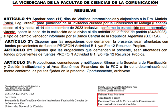 El itinerario se aprobó el 3 agosto de 2023, mediante la resolución 699/23 firmada por la vice decana Fabiana Rosa Martínez, subordinada de Parisi. En ella no estableció un monto específico, sino que lo ocultó estableciendo únicamente “aprobar once (11) días de Viáticos Internacionales y alojamiento a la Dra. Mariela Parisi, Leg. 36993, para participar de la invitación cursada por la Universidad de Málaga (España) desde el 4 y hasta el 14 de septiembre de 2023 inclusive, conforme lo establecido por la normativa vigente”.