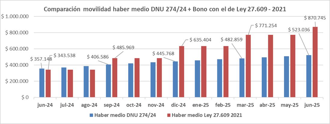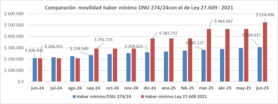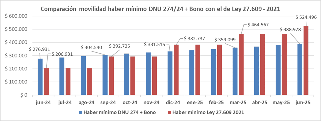 Respecto el haber jubilatorio mínimo de la ANSES, partiendo de un mismo importe de $ 206 mil en junio 2024, el correspondiente al DNU 274 supera levemente al de la ley 27.609 en los meses subsiguientes agosto y septiembre, dado el ajuste mensual de su movilidad, respecto el ajuste trimestral de esta última. Pero en septiembre 2024 el haber mínimo de la movilidad de la ley 27.609 salta a $ 292 mil, contra solo $ 234 mil del DNU 274.