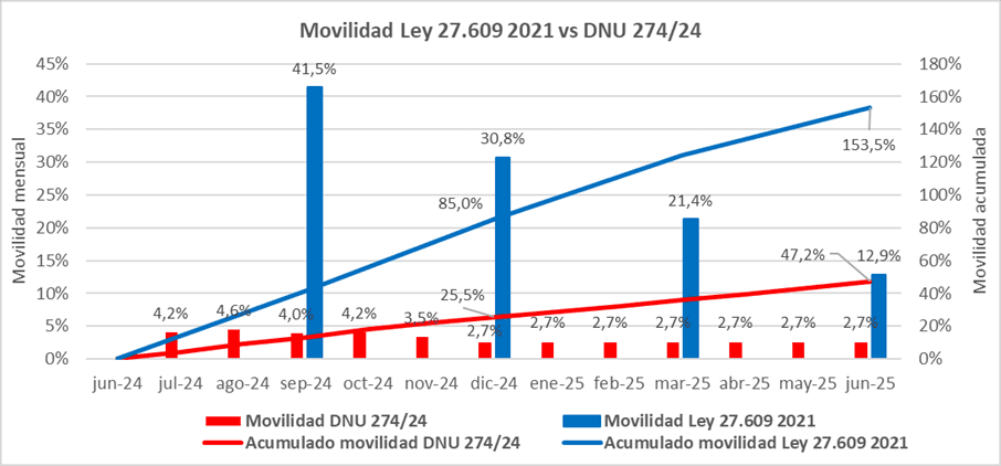 En cambio, con la movilidad de la Ley 27.609 del año 2021, con un aumento trimestral de 41,5 % en septiembre, y 30,8 % en diciembre, el acumulado sería del 85 %. Más de tres veces superior al del DNU 274. A su vez la regla del tope de la Ley 27.609, a aplicar en diciembre de cada año, arroja un incremento del 54,4 %, razón por la que prevaleció el aumento del 30,8 %. Lo cual anticipa que existirán también notables aumentos en el futuro con la anulada movilidad de la ley 27.609 del 2021.
