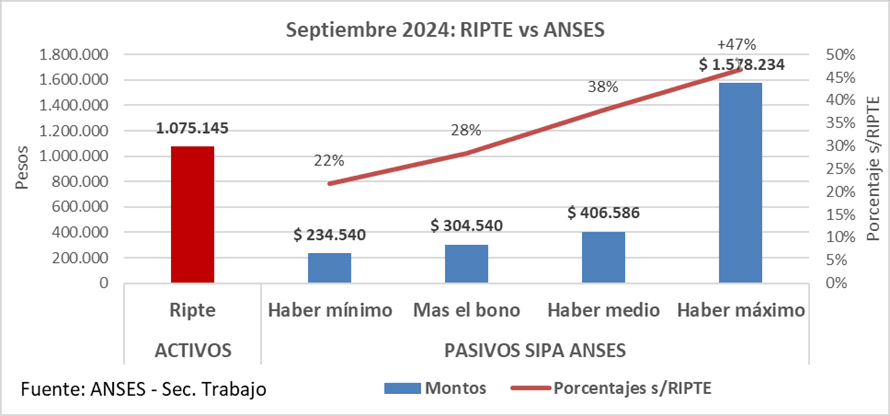 Más la suma de dicho bono, que totaliza $ 304.540, el haber mínimo solo fue el 28 % del promedio del RIPTE. O sea un 72 % menos. En cuanto al haber medio de ese mismo mes, $ 406.586, solo representó un 38% del promedio del RIPTE. O sea un 62 % por debajo. Y respecto la jubilación máxima de $ 1.578.234, esta representa solo un 47% mas que el promedio del RIPTE.