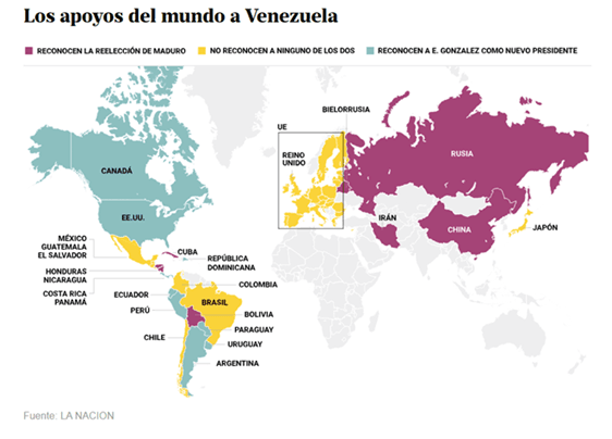 El porque de ello, y los paralelismos entre Maduro y Zelensky, lo pone en evidencia el siguiente mapa que publicó LA NACION. Tratando de explicar lo que sucedía en Venezuela, pero quedándose igual que los amorosos y cantelmis, solo en la superficie distorsionada de las cosas. Comenzando con que de dicho mapa surge que “el mundo” está lejos de mirar a Venezuela, apoyando a González Urrutia y Machado, como propagan ellos.