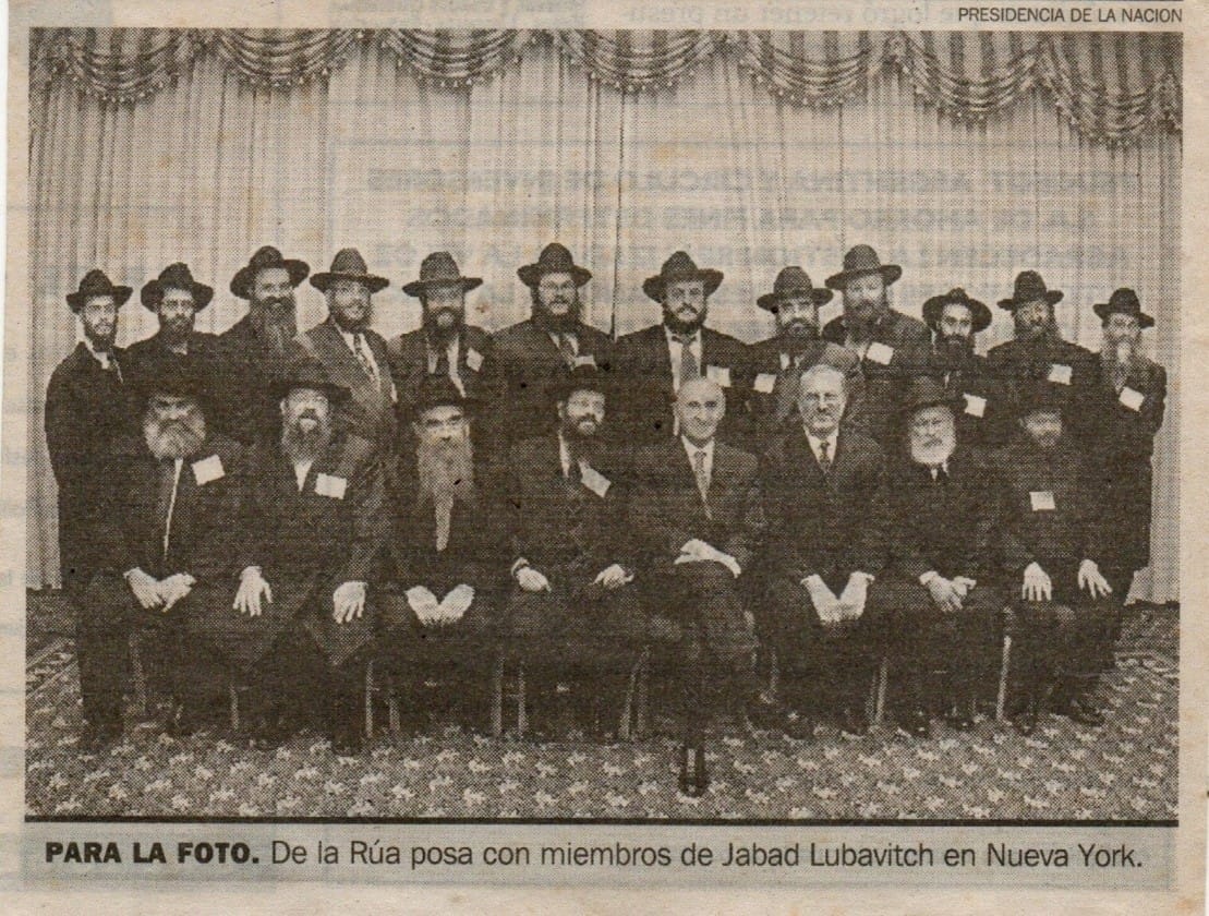 En la siguiente imagen, se puede ver al fallecido ex presidente Fernando De la Rua, rodeado en junio del 2000 por los dirigentes -todos masculinos barbudos- de la poderosa secta judía Jabad Lubavith en Nueva York. Adonde viajó para obtener el apoyo de lo que luego se denominó -sarcásticamente- el Blindaje.