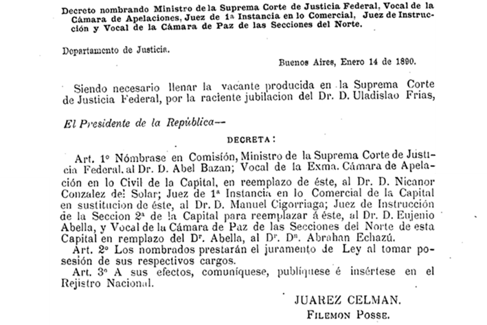 Señala a continuación que Abel Bazán, fue también nombrado en enero de 1890 en comisión como juez de la Corte, por el presidente Juárez Celman, en reemplazo de Uladislao Frías, quien se había jubilado a principios de ese año. Siendo este como se ve seguidamente, un largo decreto en el cual también se designaron las vacantes en cadena que ese ascenso de Bazán producía, que tampoco viene al caso.