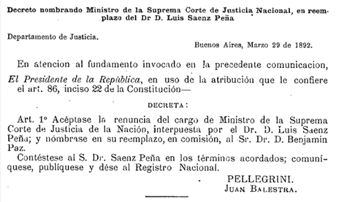 Seguidamente señala que Benjamín Paz fue nombrado en comisión como juez de la Corte, por el presidente Carlos Pellegrini, en reemplazo de Luis Sáenz Peña en marzo de 1892. Quien había renunciado a principios de ese año durante el receso del Congreso, para lanzar su candidatura a la presidencia. A la que llegó en octubre de ese año, por lo que tampoco viene al caso.