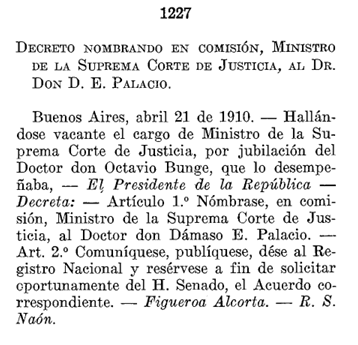 Por ultimo el decreto 137 señala que Dámaso Emeterio Palacio fue nombrado en comisión como juez de la Corte el 21 de abril de 1910, por el presidente José Figueroa Alcorta. Luego de la jubilación de Octavio BUNGE, quién se había jubilado a principios de ese año, y falleció pocos meses después, por lo que este ejemplo tampoco viene al caso.