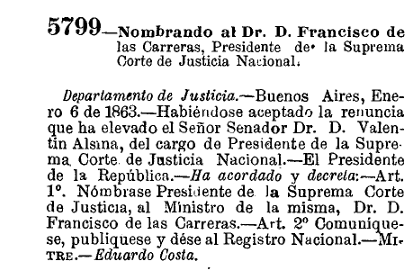 “Luego de la renuncia del doctor Valentín ALSINA, el juez Francisco DE LAS CARRERAS fue nombrado en comisión como presidente de la Corte Suprema de Justicia por el Presidente Bartolomé MITRE”. Cuando lo que hizo Mitre fue simplemente nombrarlo presidente de la Corte, pero no en comisión. Atribución que por entonces detentaba el presidente de la Nación, y que duraba mientras estuviera en el cargo. A la cual, en retribución de la infame Acordada 10 de 1930, que legalizo el golpe de Estado de ese año, el golpista presidente Gral. Agustin Justo la dejó en manos de la misma Corte.