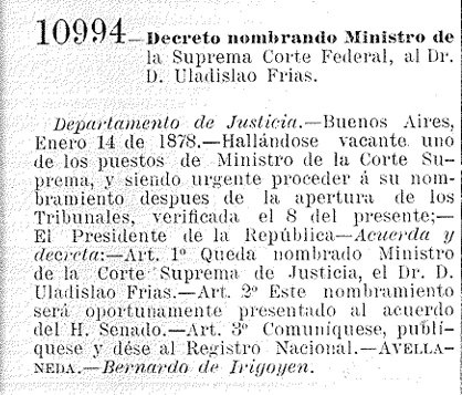 A continuación el decreto 137 señala que en el juez Uladislao FRÍAS fue nombrado juez de la Corte en comisión por el Presidente Nicolás AVELLANEDA, en sustitución de José Trifón Domínguez y López Camelo, quien había renunciado el 27 de julio de 1887. Siendo este el único caso que como se verá, hubo un nombramiento de una vacante que no se había producido durante el receso del Congreso.