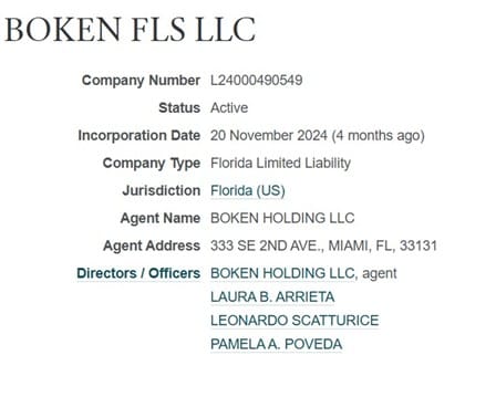 -Boken FLS LLC: Al igual que las anteriores, la firma tiene el domicilio fiscal en 333 Se 2Nd Ave, Miami, Florida, 33131, y los directores son el matrimonio Scatturice-Poveda y Arrieta.