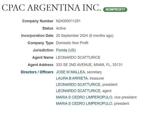 -CPAC Argentina Inc: la primera de estas firmas, tiene el mismo nombre que las iniciales de la Conferencia de Acción Política Conservadora, donde militan Arrieta, Milei, Musk y Trump. La titularidad de la compañía pertenece a Leonardo Scatturice, quién además aparece como presidente y agente. Laura Arrieta tiene el rol de tesorera. José María Mallea oficia de secretario. María Soledad Cedro Limperopulo aparece en el rol de presidenta y vice de la compañía.