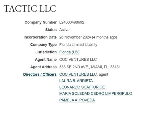-Tactic LLC: Esta firma también tiene el domicilio fiscal en 333 Se 2Nd Ave, Miami, Florida, 33131, y los directores son el matrimonio Scatturice-Poveda, Arrieta y Cedro Limperopulo.