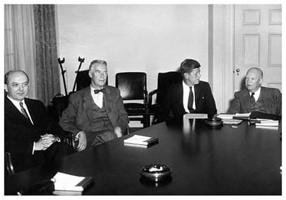 El 19 de enero de 1961, en vísperas de su investidura, el presidente electo Kennedy visitó la Casa Blanca —por última vez como invitado— junto con su equipo directivo. Tras 45 minutos de conversación individual con el presidente Eisenhower, ambos se dirigieron a la Sala del Gabinete para reunirse con los secretarios de Estado, Defensa y Tesoro, saliente y entrante, y hablar sobre la transición.