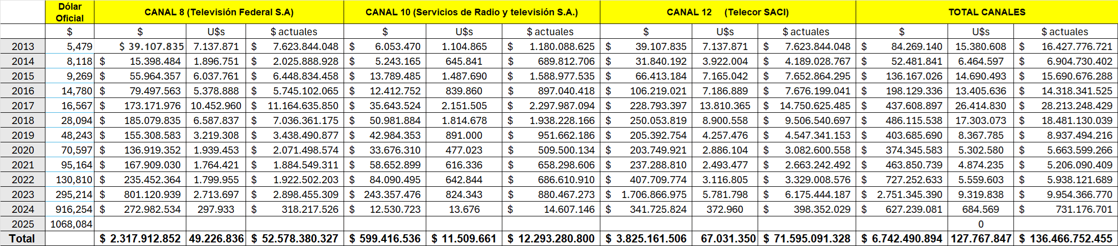 Entre 2013 y 2024 el Gobierno de Córdoba a través de De la Sota, Schiaretti y Llaryora, destinó en pauta publicitaria para los SRT un total de US$ 11.509.661, sólo el 9 % de la torta publicitaria para la tevé abierta cordobesa.