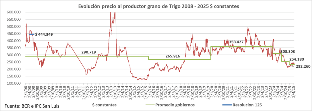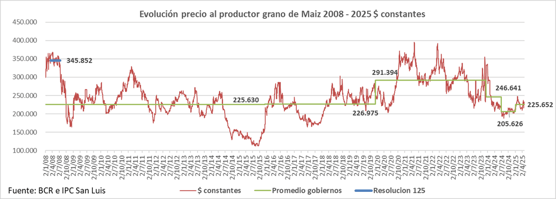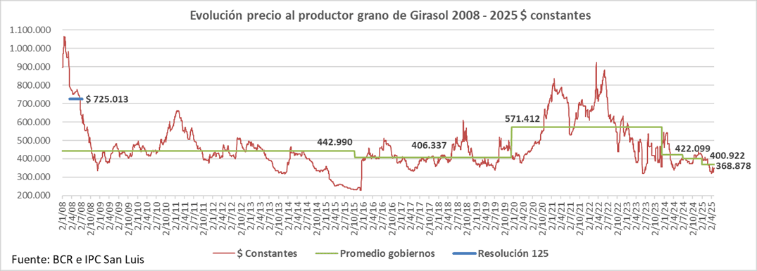 En los siguientes gráficos en base a los mismos datos, se expone la evolución del precio a $ constantes de cada grano entre los primeros días del 2008 hasta fin de abril del 2025. Visualizando también el promedio de dicho precio durante cada gobierno que hubo ínterin, y en especial a título comparativo, el que hubo durante la vigencia de la famosa resolución 125