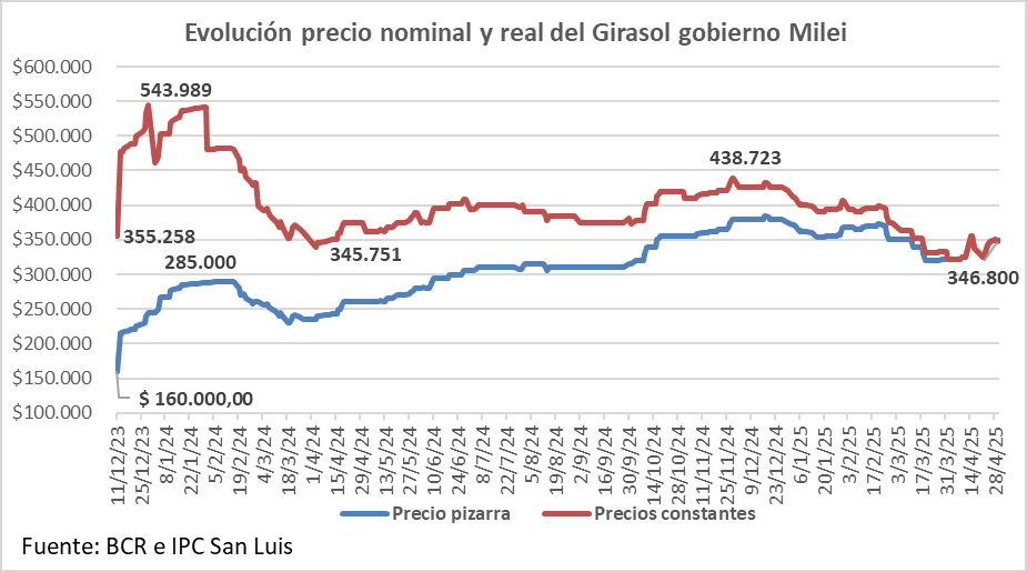 En el caso del Girasol los precios tienen un desarrollo parecido al del Trigo. Al inicio del gobierno de Milei, no obstante su macro devaluación, demoraron en llegar a un pico. El precio nominal pasó de $ 160 mil a $ 285 mil, mientras que el precio real saltó de $ 355 a $ 543 mil. Luego a principios de abril 2024 cayó a $ 345 mil, para luego en diciembre llegar a un nuevo pico de $ 438 mil, y terminar a fines de abril 2025 en $ 346 mil, con una caída entre puntas de -36 %.