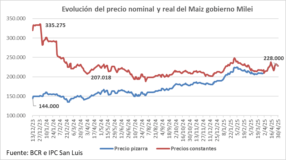 En el caso del Maíz sucedió algo parecido, pero no tan agravado. Al comienzo del gobierno de Milei con la macro devaluación, el precio pizarra pasó a $ 144 mil, mientras que ha paridad de poder adquisitivo equivalía a $ 335 mil. El que rápidamente en abril 2024 se derrumbó a $ 207 mil, para llegar a fin de abril 2025 a $ 228 mil, con una caída entre puntas de -32 %.