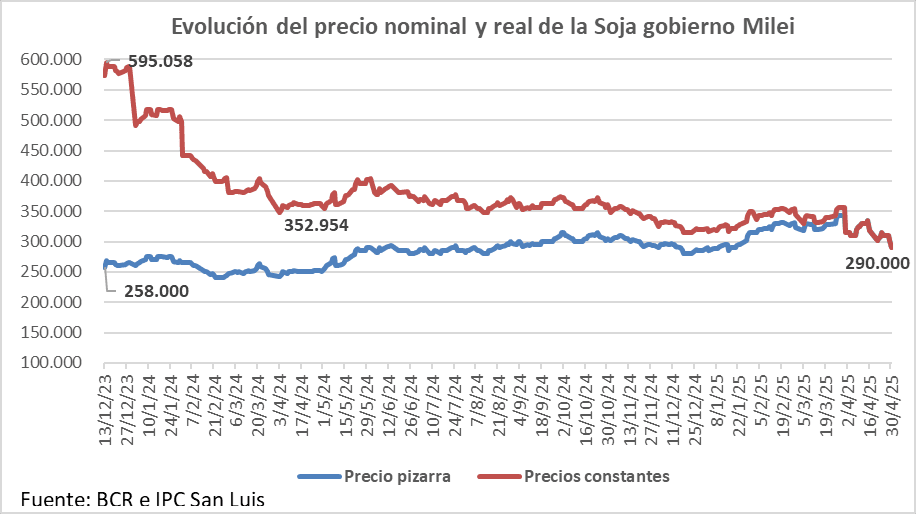En el caso de la Soja, sucedió algo parecido a lo de la 125. Con la macro devaluación inicial de Milei del 120 %, el precio nominal de pizarra era de $ 258 mil, y el precio real en paridad de poder adquisitivo a $ constantes, equivalía a $ 595 mil. Qué a poco de andar en abril 2024, cayó a $ 352 mil, para estar ahora a fines de abril 2025 en $ 290.000. Arrojando una caída entre puntas de -51 %.