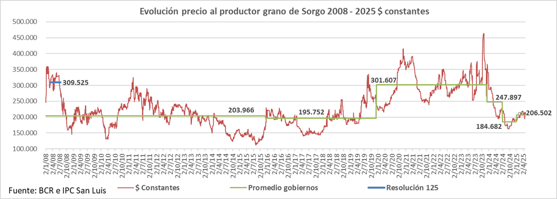 Respecto el Sorgo, su promedio durante la 125 fue de $ 309 mil, siendo ese pico superado netamente solo entre los años 2019 y 2023. Y los promedios de cada gobierno fueron con Fernández de Kirchner $ 203 mil, -34 % debajo de la 125; Macri $ 195 mil, -37 % debajo de la 125; Fernández $ 301 mil, -3 % debajo de la 125; y Milei barranca abajo con su atraso del tipo de cambio: primer semestre 2024 $ 247 mil, -20 % debajo de la 125; segundo semestre 2024 $ 184 mil, -40 % debajo de la 125; y en el primer cuatrimestre 2025 hubo una leve recuperación $ 206 mil, -33 % debajo de la 125.