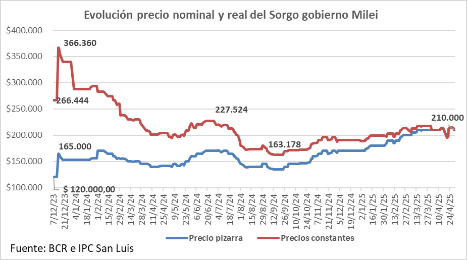 Por su parte el precio del Sorgo reaccionó casi inmediatamente ante la macro devaluación de Milei, y su precio nominal saltó de $ 120 mil a $ 165 mil, mientras que su precio a $ constantes paso de $ 266 mil a $ 366 mil. Con una acelerada caída posterior, un pequeño rebote en junio 2024, y una nueva caída posterior, que llevo su precio real a un mínimo de $ 163 mil en septiembre 2024. Para situarse a fines de abril 2025 en $ 210 mil, lo que representa una caída entre puntas de -43 %.