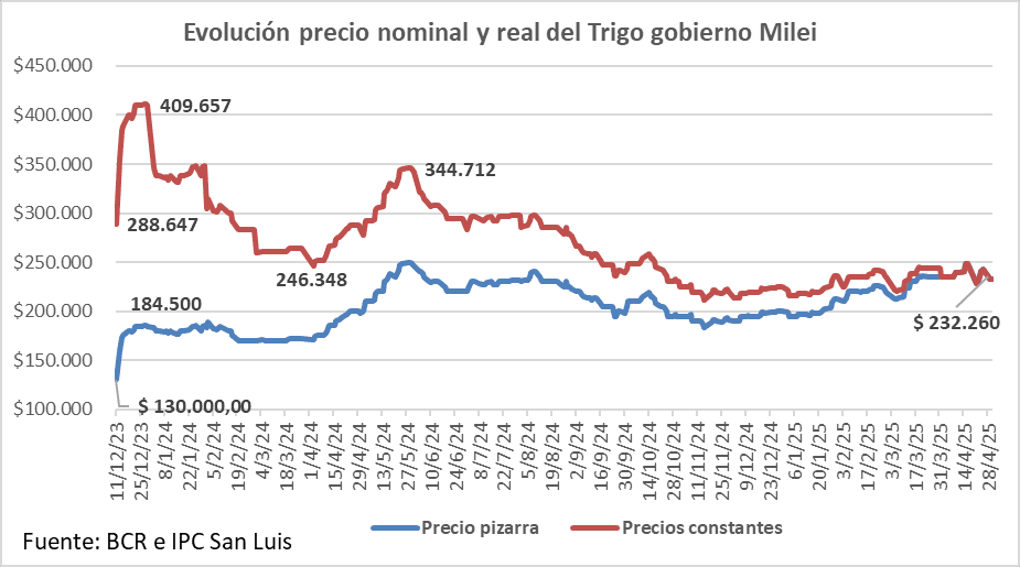 A continuación, en sucesivos gráficos correspondiente a cada grano, se muestra la evolución de los precios de pizarra nominales y reales a $ constantes entre el 13 de diciembre 2023 y el 20 de abril 2025. Que ponen en evidencia qué igual que se cocina a las ranas vivas a fuego lento, para que no adviertan el cambio de temperatura, algo parecido parece haber sucedido durante la era Milei.