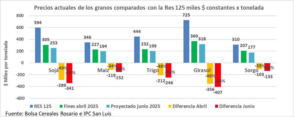 Se aprecia en él que a $ constantes, el precio promedio durante la 125 en el caso de la Soja, fue de $ 594 mil, contra $ 305 mil a fines de abril, y $ 253 proyectado para junio, con un aumento de las retenciones del 26 al 33 %. Lo que reporta una caída del poder adquisitivo del productor de -49 % en el primer caso, y de -57 % en el segundo caso.