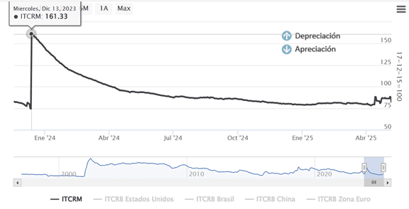 Tal como lo demuestra en forma patente la gestión de Milei, el tipo de cambio y sus variaciones son un componente esencial en el precio interno al productor agrícola, además del precio FOB o internacional, y las retenciones. Constituyendo un trípode que la gestión de Milei con su política antinflacionaria, usando al dólar como ancla, lo ha alterado enormemente, al pasar el Tipo Cambio Real Multilateral (TCRM) del BCRA de un pico de 161,33 el 13 de abril 2023, a un mínimo de el 8 de abril pasado de 78,18.