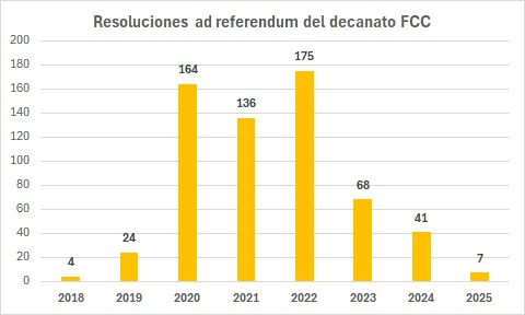 Estas resoluciones “ad referéndum” fueron cómo se puede ver en el gráfico de arriba, 4 en el 2018, apenas asumió su mandato. 24 en el 2019. 164, en el 2020 antes de su primera reelección. 136 en el 2021, año de elecciones. 175 en el 2022, cuando quería consolidar su segundo mandato luego de una victoria mínima. 68 en el 2023. 41 en el 2024. 7 este año 2025.