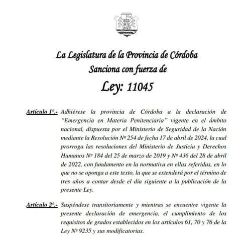 El lunes 14 de abril pasado, la vicegobernadora Myrian Prunotto firmó la Ley 11.045 por la cual la Provincia de Córdoba adhiere a “la declaración de “Emergencia en Materia Penitenciaria” vigente en el ámbito nacional, dispuesta por el Ministerio de Seguridad de la Nación mediante la Resolución Nº 254 de fecha 17 de abril de 2024, la cual prorroga las resoluciones del Ministerio de Justicia y Derechos Humanos Nº 184 del 25 de marzo de 2019 y Nº 436 del 28 de abril de 2022, con fundamento en la normativa en ellas referidas, en lo que no se oponga a este texto, la que se extenderá por el término de tres años a contar desde el día siguiente a la publicación de la presente Ley”