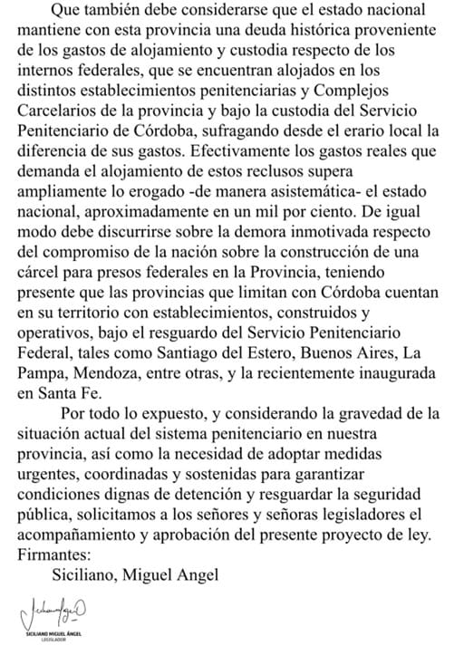 También, los fundamentos exponen la falta de compromiso de la Casa Rosada para con la asistencia de presos bajo la órbita federal: “Que también debe considerarse que el Estado nacional mantiene con esta Provincia una deuda histórica proveniente de los gastos de alojamiento y custodia respecto de los internos federales, que se encuentran alojados en los distintos establecimientos penitenciarias y Complejos Carcelarios de la provincia y bajo la custodia del Servicio Penitenciario de Córdoba, sufragando desde el erario local la diferencia de sus gastos. Efectivamente los gastos reales que demanda el alojamiento de estos reclusos supera ampliamente lo erogado -de manera asistemática- el Estado nacional, aproximadamente en un mil por ciento”.