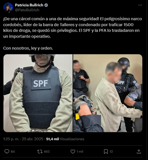 El viernes 25, Bullrich posteó en X: “¡De una cárcel común a una de máxima seguridad! El peligrosísimo narco cordobés, líder de la barra de Talleres y condenado por traficar 1500 kilos de droga, se quedó sin privilegios. El SPF y la PFA lo trasladaron en un importante operativo. Con nosotros, ley y orden”.