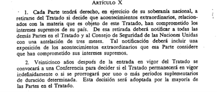 - Además, cualquier estado “tendrá derecho, en ejercicio de su soberanía nacional, a retirarse del Tratado si decide que acontecimientos extraordinarios, relacionados con la materia que es objeto de este Tratado, han comprometido los intereses supremos de su país. De esa retirada deberá notificar a todas las demás Partes en el Tratado y al Consejo de Seguridad de las Naciones Unidas con una antelación de tres meses” (artículo 10).