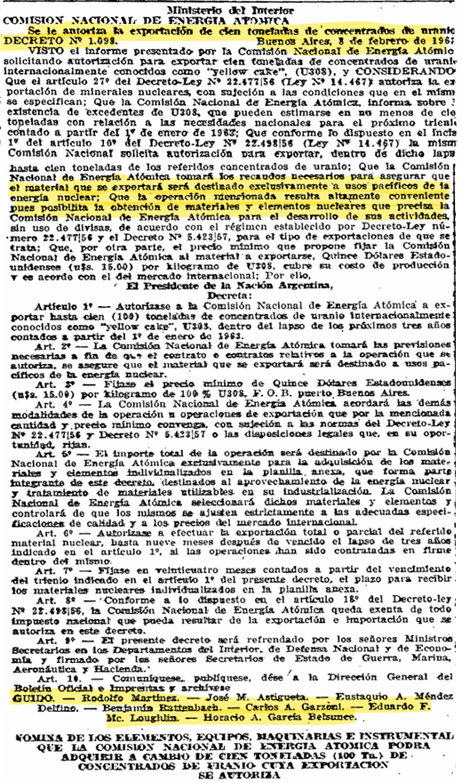 Quienes facilitaron ese desarrollo nuclear israelí, fueron los presidentes argentinos José María Guido y Humberto Illia. El primero emitió en febrero de 1963 el decreto 1098 que le permitió a la CNEA, Comisión Nacional Energía Atómica, la exportación de 100 toneladas de concentrado de uranio (yellow cake) a lo largo de tres años, con la excusa de que de esa manera la CNEA podía reequiparse.